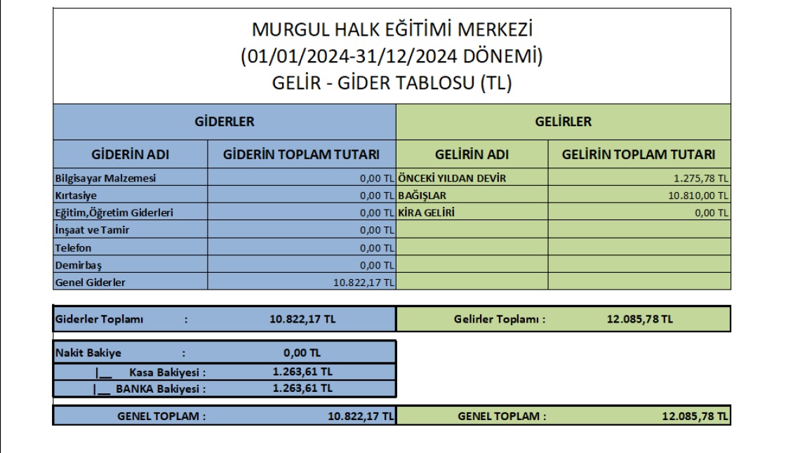 01.01.2024/31.12.2024 DÖNEMİ MURGUL HALK EĞİTİMİ MERKEZİ OKUL-AİLE BİRLİĞİ GELİR-GİDER TABLOSU